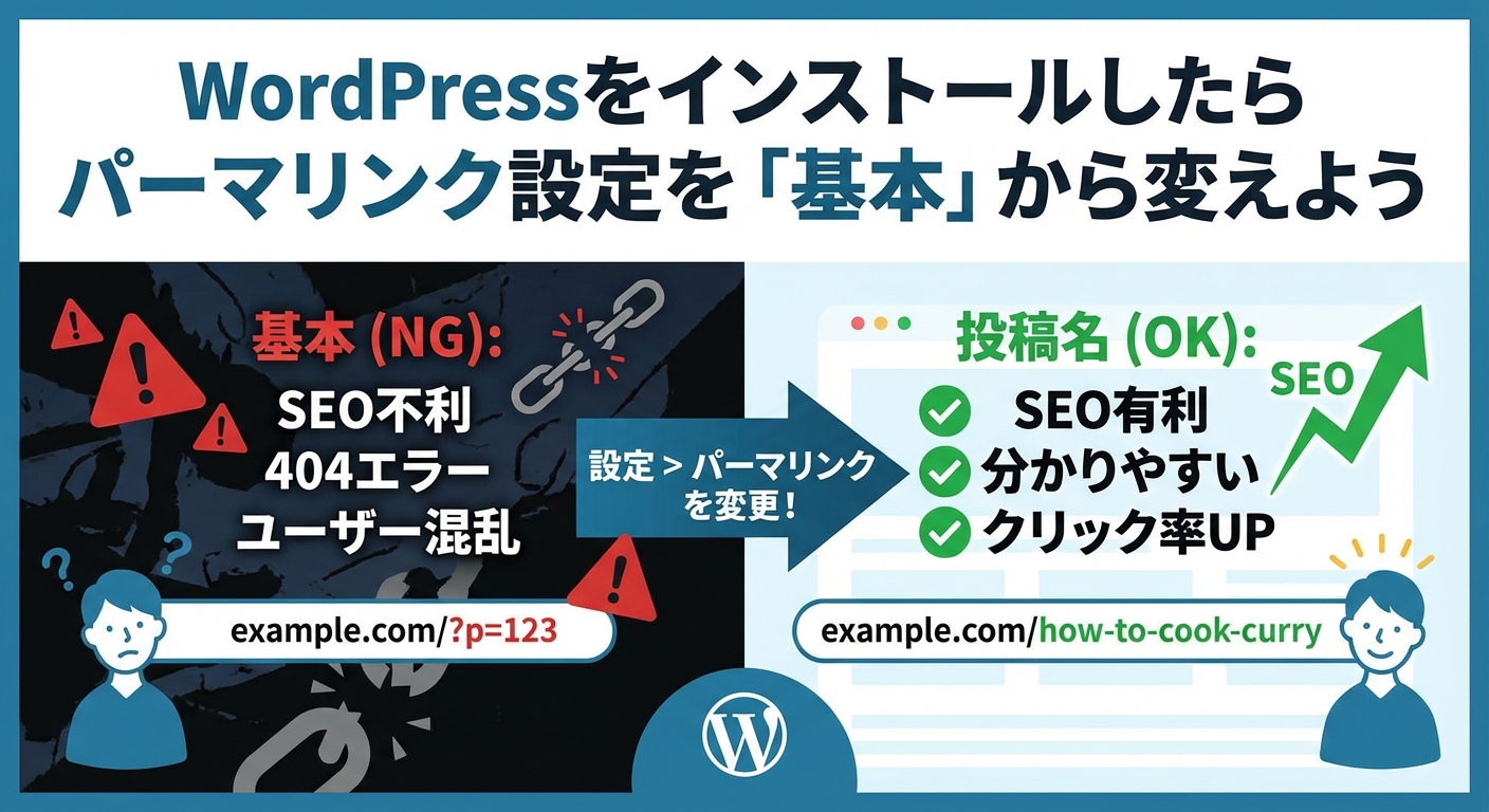 WordPressをインストールした直後のデフォルト状態である「基本(?p=123)」設定。一見シンプルですが、現代のウェブサイト運営においては「百害あって一利なし」と言えるほどデメリットがあります。
